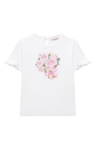 На футболке белого цвета распустились нежные пудровые розы. Таким романтичным принтом дизайнеры бренда украсили модель из мягкого органического хлопка с длинными тонкими волокнами. Его бережно вырастили и обработали без применения вредных химикатов, поэтому слегка эластичное джерси получилось особенно приятным на ощупь. Для удобства сзади предусмотрели пуговицу.