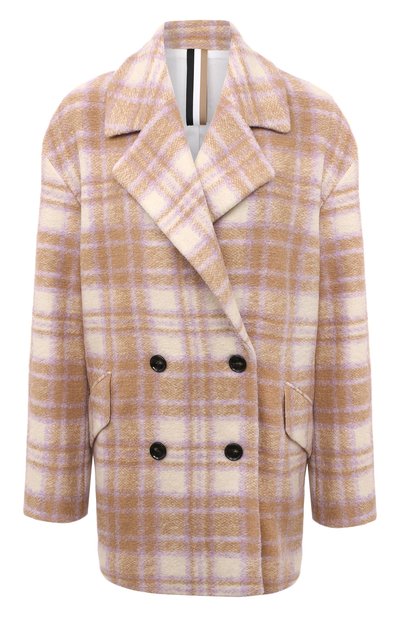 Крой бежевого пальто дизайнеры марки, основанной Хуго Фердинандом Боссом, позаимствовали у двубортного пиджака с широкими лацканами. Для пошива модели с мягкой линией плеч использовали фактурный текстиль с клетчатым мотивом. В состав добавили прочный полиакрил, гладкий полиэстер и мягкую шерсть, поэтому материал не пропускает ветер и согревает при незначительном похолодании.