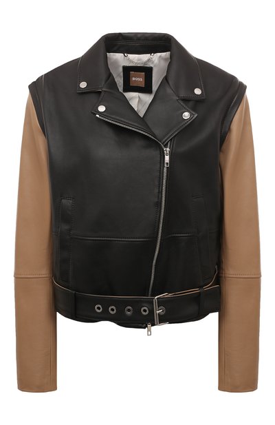 Бежевые рукава не только придают черной косухе новое звучание, но и превращают ее в модель 2-в-1. Контрастные детали можно отстегнуть и носить куртку из мягкой матовой наппы как жилет. Сочетание цветов, отсылающее к фирменному триколору, повторяется на широком двухстороннем ремне из такой же нежной кожи ягненка.