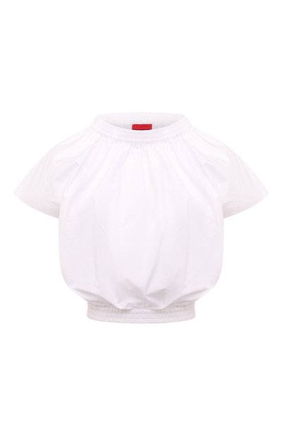 Мастера бренда, основанного Хуго Фердинандом Боссом, сшили топ из шелковистой хлопковой ткани. Тонкий, приятный на ощупь материал чистого белого цвета меньше притягивает солнечные лучи и хорошо пропускает воздух. Фактурная драпировка вдоль пояса и горловины в сочетании с короткими цельнокроеными рукавами формирует объемный силуэт.