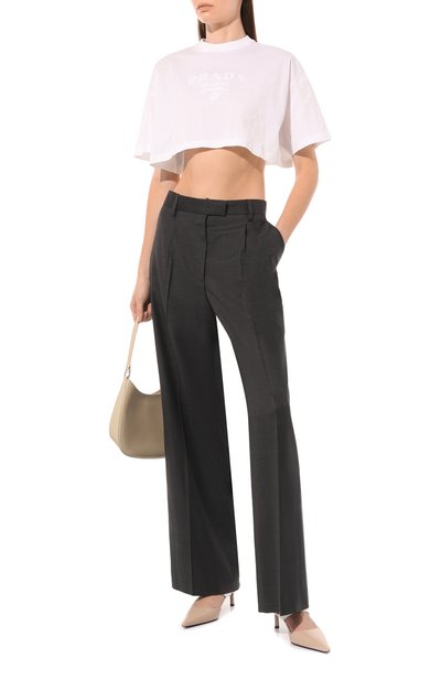 Мастера марки использовали для изготовления белой футболки мягкое джерси. Материал, связанный из премиального хлопка, хорошо пропускает воздух и тянется, не сковывая движения. Миучча Прада и Раф Симонс украсили модель розовой вставкой с объемным карманом на молнии, выполненной из ткани Re-Nylon на основе переработанного нейлона. Для декора выбрали треугольную эмалевую пластину.
