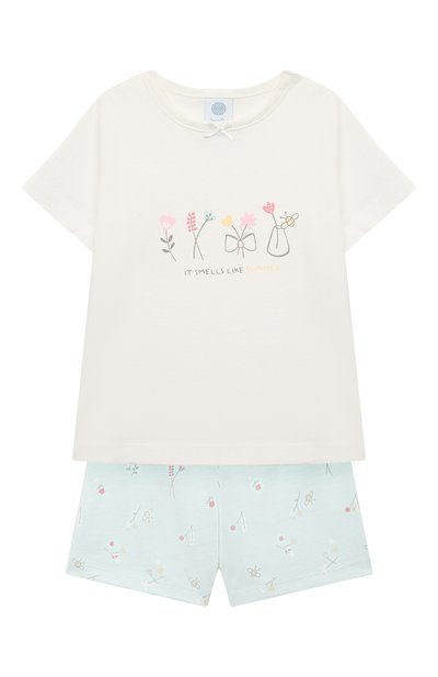 Для изготовления пижамы использовали мягкий хлопковый трикотаж. Гипоаллергенный материал не раздражает нежную кожу ребенка и идеально пропускает воздух, делая отдых более комфортным. Белую футболку и голубые свободные шорты декорировали нежным принтом в виде цветов, словно нарисованных детской рукой.