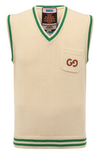 Вдохновившись поп-культурой, Алессандро Микеле декорировал кремовый жилет сзади крупным ярким мотивом в виде логотипа, ананаса и роз. Для изготовления модели с V-образным вырезом использовали мягкую хлопковую пряжу. Края подчеркнули полосатым зеленым узором, а накладной нагрудный карман украсили монограммой GG из инициалов Гуччио Гуччи.