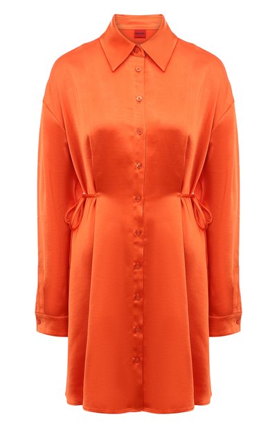 Огненно-красный цвет и блеск ткани делают это короткое платье-рубашку самодостаточным, поэтому мы предлагаем носить его с черными сапогами и сумкой. Для пошива модели мастера марки, основанной Хуго Фердинандом Боссом, использовали струящийся гладкий атлас, на 60% состоящий из вторичного сырья. По бокам изделие дополнили длинными шнурами, формирующими приталенный силуэт.