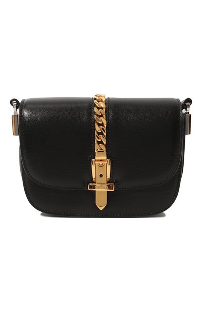Небольшую черную сумку Sylvie 1969 с регулируемым плечевым ремнем мастера марки, основанной Гуччио Гуччи, выполнили из блестящей тисненой кожи, устойчивой к царапинам. Широкий клапан модели украсили золотистой цепочкой с пряжкой, на которой выгравировали логотип. В аксессуар поместятся смартфон, ключи и картхолдер.