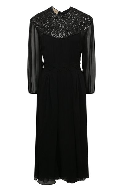 Черное миди-платье с немного укороченными рукавами мастера марки, основанной Гуччио Гуччи, сшили из тонкого полупрозрачного шелка, который ложится мягкими складками. На контрасте с нежным материалом играет широкая вставка, обрамляющая линию плеч: плотную деталь полностью расшили мерцающими пайетками разного размера. В комплекте — нижнее платье в тон.