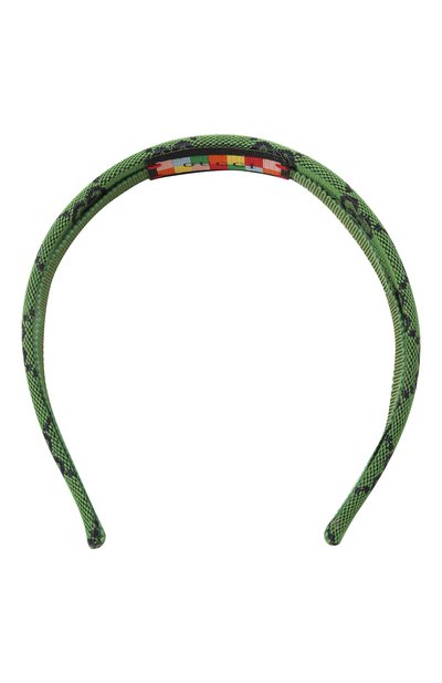 Узкий зеленый ободок выполнили из прочного фактурного жаккарда с графичным паттерном в виде GG-монограммы. Гибкий каркас аксессуара плотно обхватывает голову, но при этом не сдавливает, а рифленая лента с внутренней стороны не дает ему скользить по волосам.