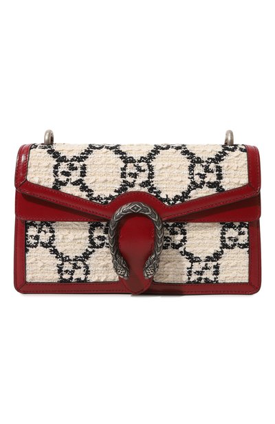 Сумка Dionysus GG с серебристым ремнем-цепочкой сшита из гладкой красной кожи с матовым блеском и фактурного кремового твида с монограммами, сложенными из инициалов Гуччио Гуччи. Модель украшена крупной пряжкой цвета античного серебра, вдохновленной мифом о греческом боге Дионисе, который пересек реку на тигре. В два отделения и карман, застегивающийся молнией, поместятся телефон, кошелек и флакон любимого аромата.
