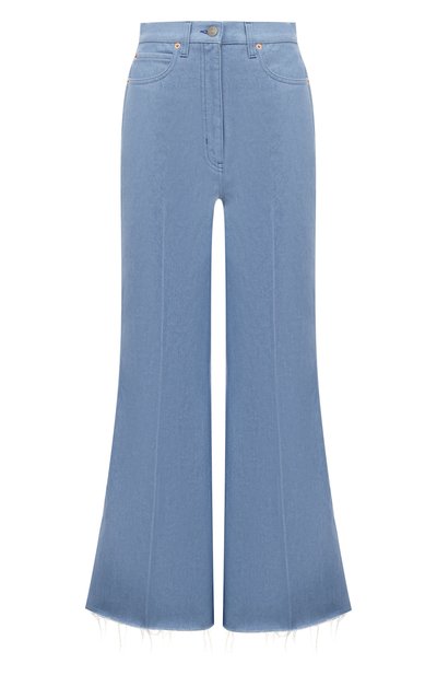 Голубые джинсы из плотного хлопка напоминают модели из 1970-х, а современное звучание им задают края брючин. Их мастера марки, основанной Гуччио Гуччи, намеренно не обработали, сформировав иллюзию укороченной вручную вещи. Завышенная посадка изделия в тандеме со стрелками визуально моделируют силуэт.