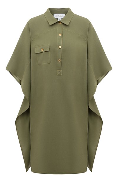 Мастера марки использовали для создания платья с отложным воротником и накладным карманом тонкий легкий хлопок цвета хаки. Свободную модель, стилизованную под пончо, дополнили короткой пуговичной планкой, которая поможет отрегулировать глубину выреза.