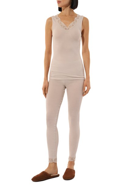 Топ с узкими регулируемыми бретелями украсили кантом из цветочного кружева кале на V-образном декольте. Модель выполнили из шелкового атласа.