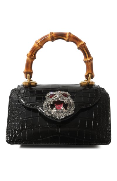 Небольшая черная сумка с короткой бамбуковой ручкой и съемным плечевым ремнем-цепочкой сшита из прочной лакированной кожи аллигатора с неповторимым природным рисунком. Фигурный клапан аксессуара украшен объемной кристальной аппликацией в виде головы тигра. В три отделения поместятся смартфон, кошелек и ключи.