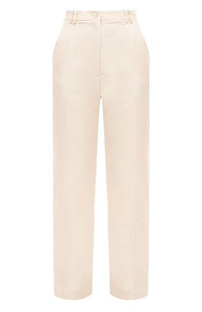Дизайнеры марки адаптировали брюки для теплой погоды, выбрав для их пошива тончайшую ткань на основе вискозы. Нежные, отлично пропускающие воздух волокна дополнили прочным льном, который охлаждает кожу на несколько градусов даже в сильную жару. Кремовая модель прямого кроя оставляет движения свободными.