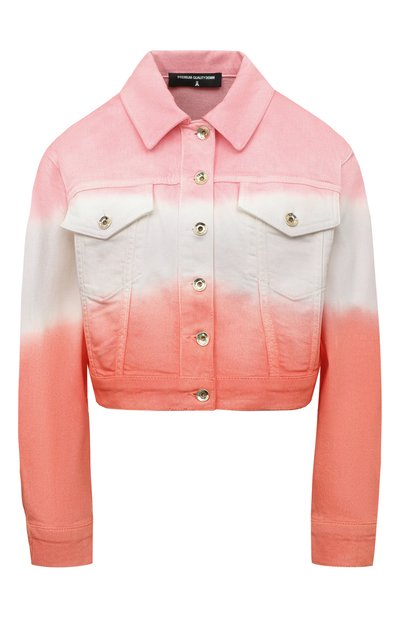 Укороченную розовую куртку мастера марки окрасили в технике деграде, создав на изделии полосатый мотив с плавным переходом оттенков. Для пошива модели с отложным воротником использовали прочный эластичный хлопок. Пояс сзади украсили крупным белым патчем с золотистой эмблемой бренда.