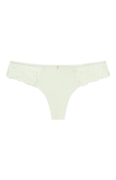 Светло-фисташковые трусы-бразильяна выполнили из гладкой микрофибры и эластичного кружева с цветочными мотивами. Белье из этих нежных тонких материалов приятно ощущается на теле и не выделяется под облегающей одеждой. Модель декорировали миниатюрным золотистым шармом на поясе.