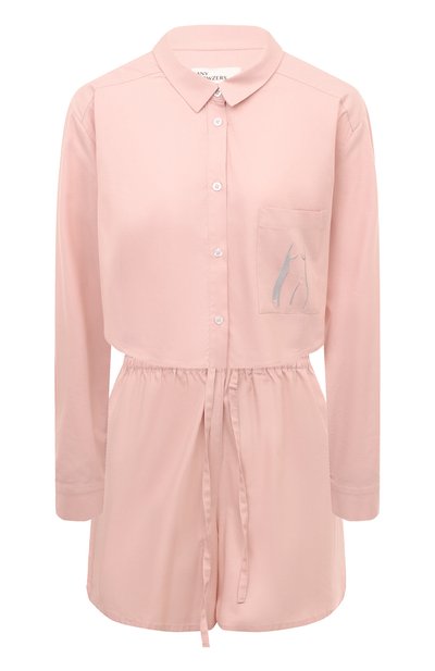 Для пошива светло-розовой пижамы мастера марки использовали гладкий тонкий материал на основе длинноволокнистого хлопка и шелковистого модала. Модель из такого текстиля хорошо пропускает воздух и быстро впитывает влагу. Накладной карман на укороченной рубашке украсили вышитым цветком. Шорты дополнили широким эластичным поясом с кулиской.
