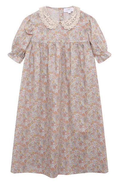 Для пошива разноцветного платья с короткими задрапированными рукавами мастера марки использовали тонкий нежный хлопок с деликатным растительным принтом. Рисунку на материале вторит узор на кремовом отложном воротнике из ажурного кружева. Модель со слегка расклешенным подолом застегивается сзади миниатюрными пуговицами.