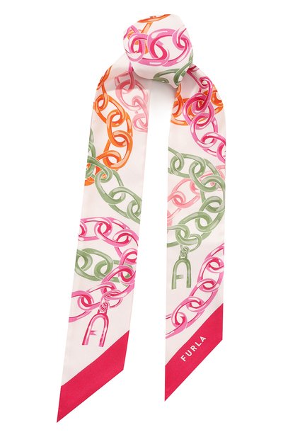 Розовый узкий шарф-бандо с принтом в виде фирменных цепей с одной стороны и однотонный с другой сшили из тонкого шелкового твила. Немнущийся материал хорошо ложится в складки, поэтому узел получится объемным и скульптурным. Попробуйте украсить аксессуаром ручку любимой сумки или повязать на запястье, как браслет.