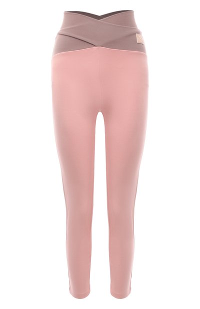 Мастера марки выполнили светло-розовые легинсы из мягкого дышащего материала, в составе которого соединили шелковистую вискозу с прочным нейлоном и эластичной лайкрой. Широкий асимметричный пояс, будто составленный из двух перекрещивающихся деталей кофейного оттенка, слегка моделирует силуэт.