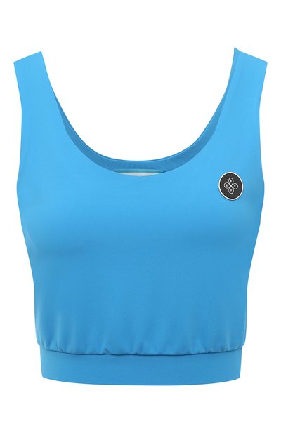 Ярко-голубой кроп-топ с широкими бретелями и глубокими круглыми вырезами с двух сторон идеально дополнит образ в спортивном стиле. Однотонную облегающую модель, украшенную только круглым патчем с эмблемой марки, сшили из мягкого элас тичного трикотажа с шелковистой гладкой поверхностью. Одежда из такого материала поддерживает комфортный для тела микроклимат и не ограничивает свободу движений.
