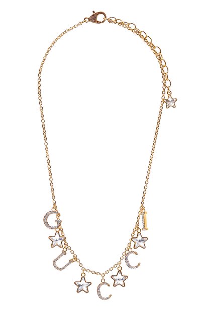 Тонкое колье-цепочку выполнили из ювелирного сплава с покрытием цвета желтого золота. Модель украсили небольшими подвесками в виде пятиконечных звезд и литер, складывающихся в название марки. Каждую из них инкрустировали полупрозрачными кристаллами, ярко сверкающими в лучах света.