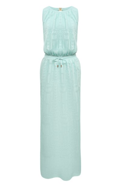 Светло-зеленое макси-платье выполнили из легкого вискозного трикотажа с ажурным узором, который придает материалу сходство с нежным кружевом. Деликатный блеск полотну придали, вплетя в основу тончайшие металлизированные нити. Пояс дополнили кулиской со шнуром, которым можно регулировать посадку на талии.