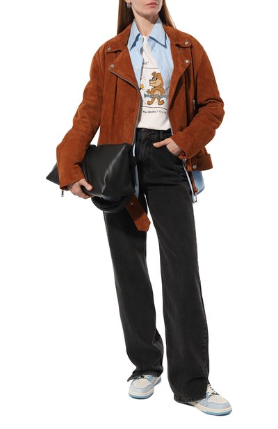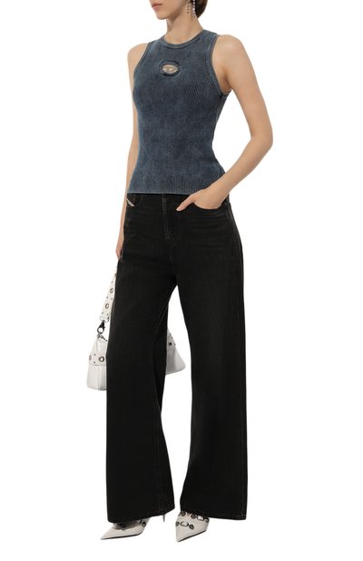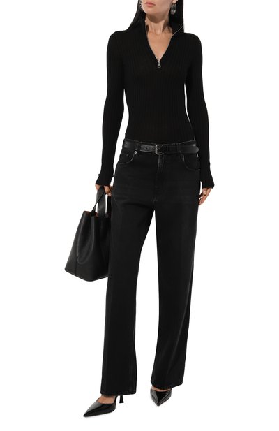 Лаконичные черные брюки дизайнеры марки превратили в трансформер: брючины сделали отстегивающимися, поэтому модель с крупными разрезами можно носить как шорты. Для пошива изделия использовали плотный деним, изготовленный из органического хлопка, который вырастили без вредных химикатов.