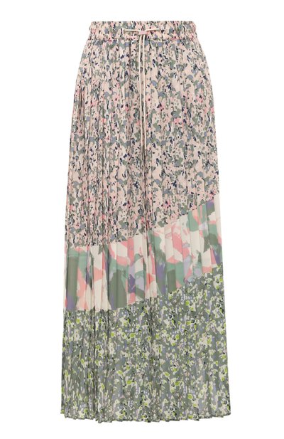 Для пошива плиссированной юбки мастера марки, основанной Хуго Фердинандом Боссом, использовали легкую струящуюся ткань с тремя видами камуфляжных принтов, связанных общей цветовой гаммой. Тонкие длинные нити полиэстера для материала переработали из пластиковых отходов, что помогло сократить количество мусора и сэкономить природные ресурсы. Посадка на талии регулируется поясом-кулиской.