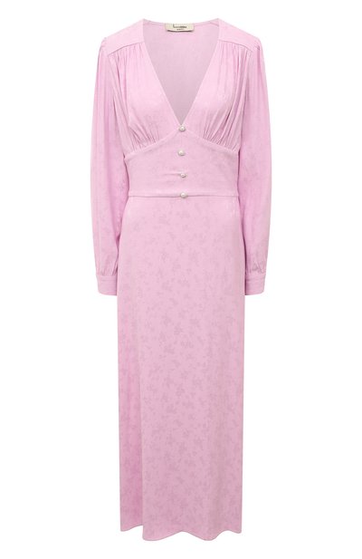 При создании приталенного платья холодного розового оттенка Светлана Родина большое внимание уделила конструкции лифа. Сложносочиненный верх с выразительной драпировкой, отсылающий к на рядам из 1980-х, дизайнер уравновесила максимально лаконичным подолом. Мастера марки сшили модель из тончайшей вискозы с жаккардовым цветочным узором. Легкий блеск нежной ткани усилили пуговицами с перламутровыми кабошонами и прозрачными кристаллами Swarovski.