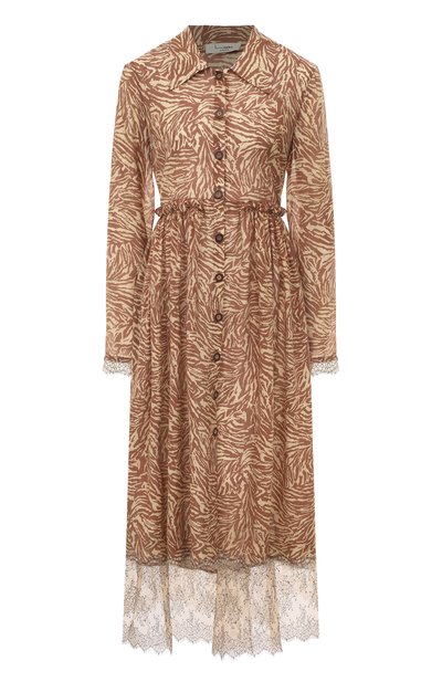 Платье-рубашка без труда справится с ролью коктейльного: останется надеть туфли на шпильке и взять в руки миниатюрную сумку. Нужный тон Светлана Родина сформировала фактурной оборкой на талии и широким кружевным кантом на подоле и рукавах. Свободную модель выполнили из тончайшей, приятной на ощупь вискозной ткани с абстрактным принтом в песочно-коричневых тонах.