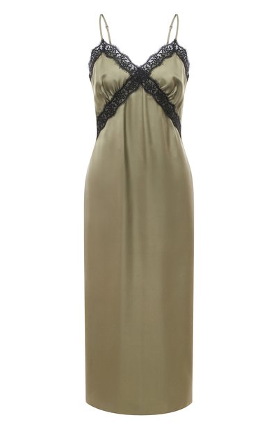 Светлана Родина представила свою версию платья-комбинации с узкими регулируемыми бретелями. Дизайнер украсила модель лентой из черного цветочного кружева, подчеркнув им фигурное декольте и лиф. Для пошива прямого изделия с высоким разрезом сзади использовали гладкий шелковый атлас оттенка хаки.