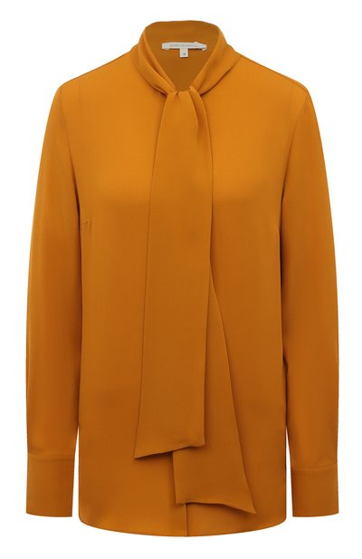 При создании блузы оранжевого цвета дизайнеры марки отдали роль декора воротнику-аскот, который можно завязать крупным бантом или оставить свободно ниспадать как шарф. Для пошива модели с длинными рукавами использовали легкий матовый шелк, который почти не мнется.