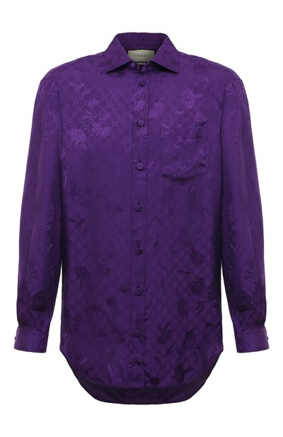 Знаковый для марки орнамент из монограммы GG на этой фиолетовой рубашке подружили с цветочным паттерном, который сделал брендированный мотив менее графичным. Визуальный объем жаккардовому узору придал шелковистый блеск тонкой легкой вискозы.