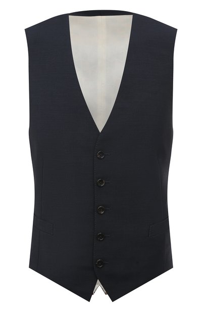 Для пошива чернильно-синего жилета мастера марки, основанной Гуччио Гуччи, использовали тонкую премиальную шерсть с добавлением нежного легкого мохера. Изделие из такого материала долго сохраняет безупречный вид, а ремешок с пряжкой сзади делает силуэт более статным. Спинку выполнили из гладкого блестящего атласа с геометрическим принтом, создающим визуальный эффект.