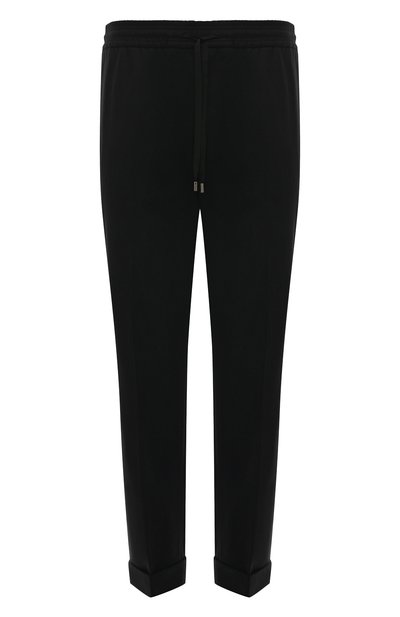 Прямые черные брюки со стрелками подойдут тем, кто не обременен строгим офисным дресс-кодом. Градус формальности изделия снижают отвороты и широкий эластичный пояс с регулируемой кулиской, как у джоггеров. Для пошива модели мастера марки, основанной Гуччио Гуччи, использовали мягкую ткань из премиальной шерсти. Плотное переплетение нитей сделало материал прочным и почти немнущимся.