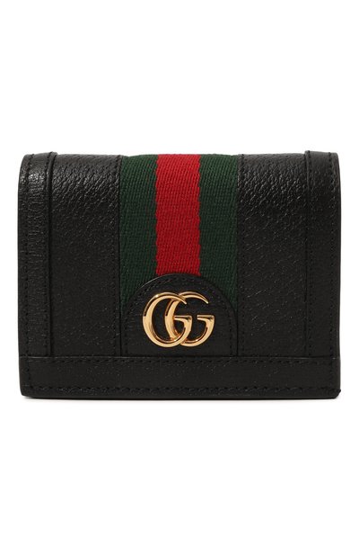 Для изготовления черного портмоне использовали матовую крупнозернистую кожу, устойчивую к заломам и царапинам. О принадлежности аксессуара бренду говорят золотистая монограмма GG и широкая красно-зеленая лента Web на клапане. Внутри модели, закрывающейся на кнопку, есть пять слотов для банковских карт, карман для купюр и отделение для монет.
