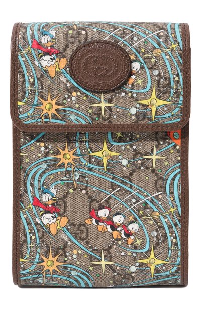 Коричневый чехол для смартфона, стилизованный под миниатюрную прямоугольную сумку, сшили из прочного канваса с узором GG Supreme. Аксессуар из капсульной коллекции с Disney украсили разноцветным принтом, напоминающий сцену из мультфильма про приключения Дональда Дака и его племянников. Аксессуар с регулируемым плечевым ремнем дополнили тремя слотами для кредитных карт.