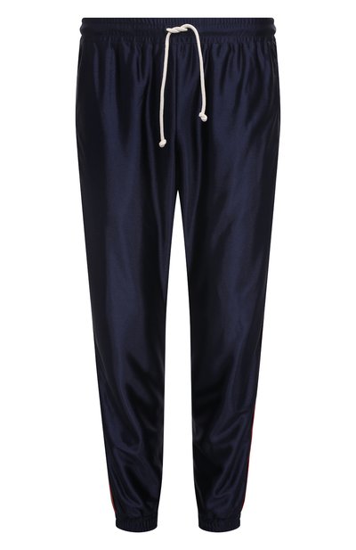Темно-синие джоггеры громко заявляют о своей принадлежности бренду: брюки дополнили лампасами, которые стилизовали под знаковую ленту Web. С ними перекликается овальный патч сзади, который выделили вышитой эмблемой в виде инициалов Гуччио Гуччи. Для пошива модели с эластичным поясом-кулиской выбрали мягкий шелковистый текстиль.