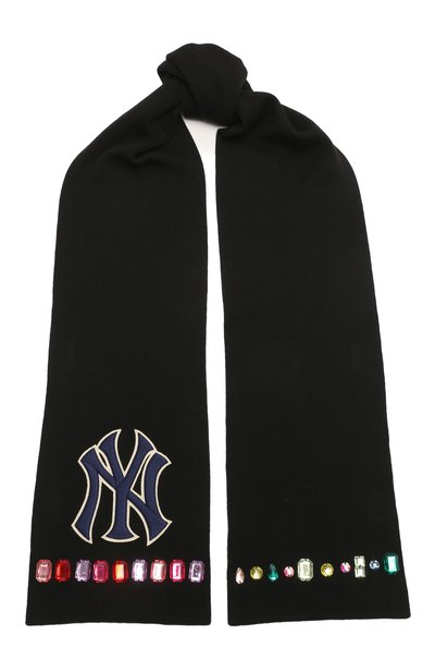Черный шарф из капсульной коллекции, созданной вместе с Североамериканской бейсбольной лигой, украшает вышитый патч, отсылающий к логотипу команды New York Yankees. По краям аксессуара, связанного из шелковистой, хорошо сохраняющей тепло шерсти, пришили разноцветные кристаллы, которые сделали его не только комфортным, но и ярким.