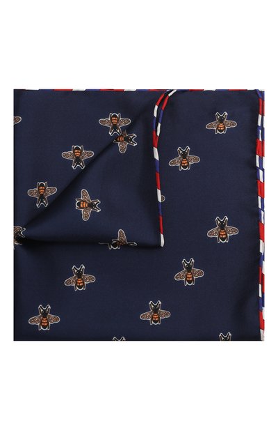 Принадлежность синего платка марке читается в паттерне в виде знаковых пчел. Края изделия подчеркнули ярким кантом в цветах ленты Web, словно заключив узор в рамку. Для изготовления аксессуара использовали почти невесомый шелковый твил с делика тным блеском.