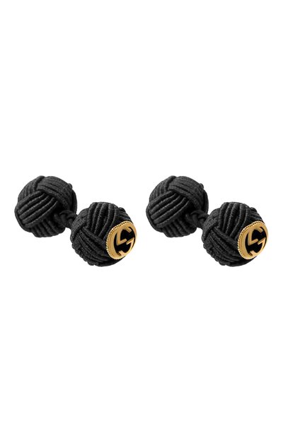 Черные запонки Silk Knot стали идеальным фоном для блестящего декора в виде знаковой архивной монограммы GG из ювелирного сплава с золотым покрытием. Для изготовления модели с гибкой перемычкой мастера марки использовали шелковистый прочный шнур, создав эффект клубка пряжи.