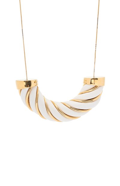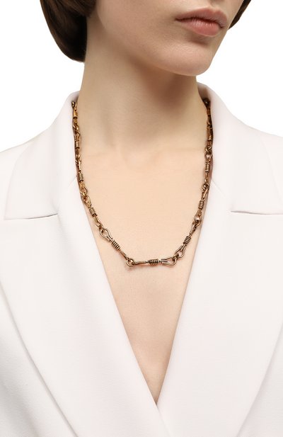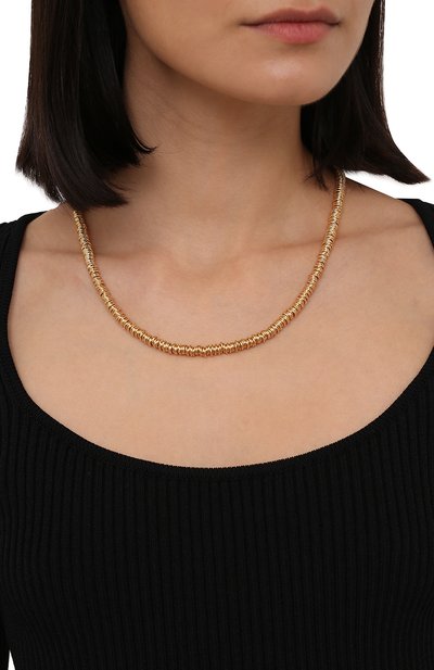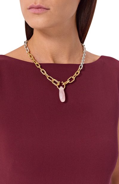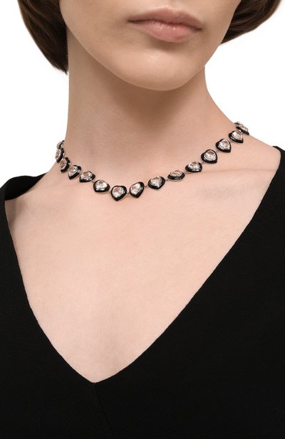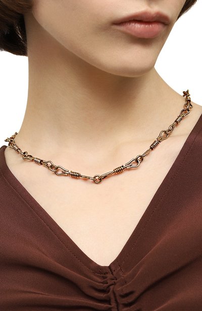 В капсульную коллекцию, посвященную вековому юбилею марки, вошло короткое колье в виде массивной рифленой цепи панцирного плетения. Для изготовления аксессуара использовали полированный ювелирный сплав с сияющим палладиевым покрытием. Яркость модели добавляют розовые подвески в виде литер, которые складываются в название бренда и цифру 100.