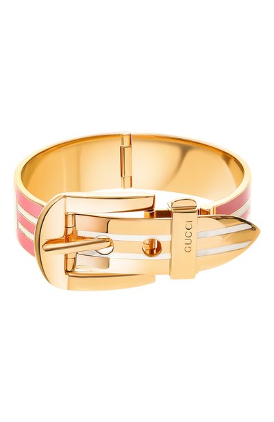 Розовый браслет, напоминающий ремешок с крупной фигурной пряжкой и узким тренчиком, выполнили из легкого ювелирного сплава. Материал отполировали до глянцевого блеска, поддержав его эмалевым покрытием. Модель украсили знаковым узором с изображением полос и монограммы GG.