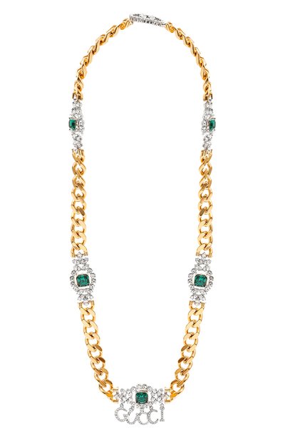 Колье выполнили в виде цепи с крупными звеньями, используя для ее изготовления легкий ювелирный сплав с золотистым покрытием. На контрасте с основной частью играют фигурные вставки из металла с палладиевым слоем, холодный блеск которых усиливают прозрачные и зеленые кристаллы. Центральную из таких деталей украсили подвесками, складывающимися в логотип бренда.
