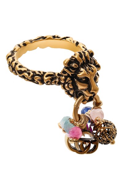 Касту этого аксессуара мастера марки придали форму дверного молотка в виде головы рычащего льва. Кольцо, зажатое в зубах хищника украсили подвесками с ажурной сферой, знаковой монограммой GG и гранеными разноцветными бусинами. Для изготовления модели использовали золотистый ювелирный сплав, подчеркнув рельефный узор чернением.