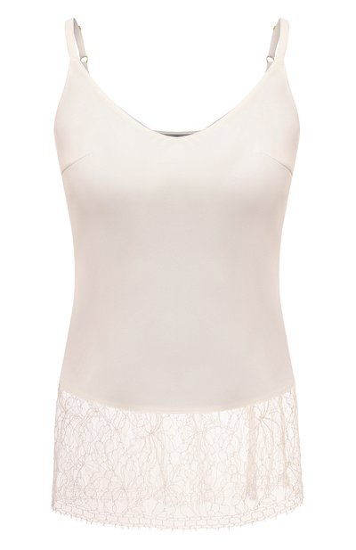 Приталенный топ в бельевом стиле мастера бренда выполнили из тончайшего шелкового атласа, который особенно приятен на ощупь. На контрасте с легким блеском этой нежной молочно-белой ткани играет широкий матовый кант из полупрозрачного цветочного кружева в тон. Узкие бретели Игорь Чапурин дополнил слайдерами, поэтому посадку на груди легко отрегулировать до идеальной.