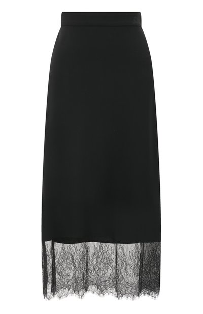При создании этой миди-юбки Игорь Чапурин возвел черный цвет в абсолют. Для пошива модели дизайнер выбрал гладкий плотный шелк с матовым блеском, противопоставив этому материалу почти невесомое полупрозрачное кружево в тон. Из него выполнили широкую вставку, обрамляющую изделие снизу.