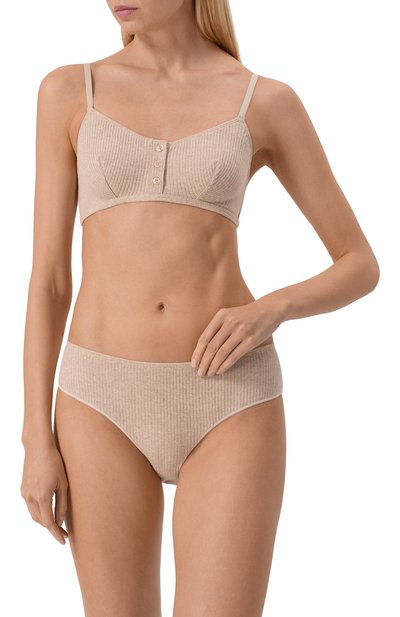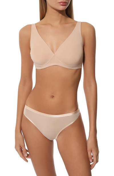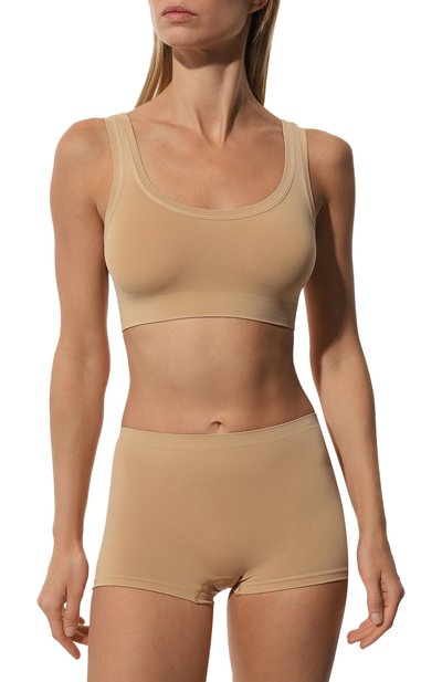 Для создания бежевого топа мастера бренда использовали тончайшую микрофибру, которая ценится за исключительную мягкость. Края проработали максимально тщательно, а снизу предусмотрели эластичный пояс, нежно поддерживающий грудь. Благодаря бесшовной конструкции модель с узкими бретелями максимально неощутима на теле.