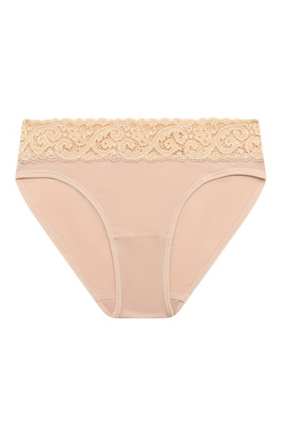 Светло бежевые слипы сшили из приятного на ощупь хлопкового трикотажа, который будет отлично пропускать воздух и быстро отводить влагу. Широкий пояс выполнили из нежного эластичного кружева с цветочным мотивом. Края трусов отделали мягкими резинками.