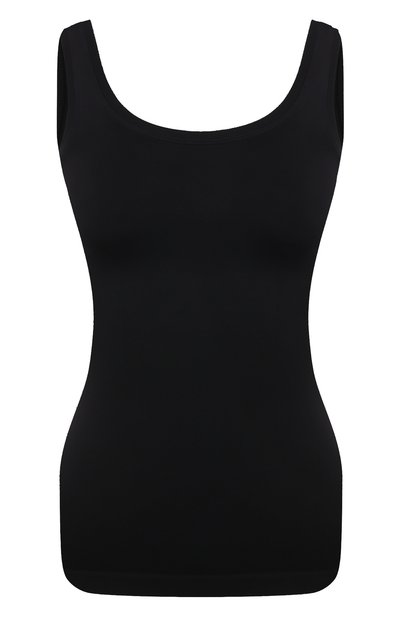 Черный топ максимально комфортно облегает тело и почти не ощущается на нем: для его создания выбрали нежную микрофибру, которая в мягкости превосходит хлопок и шелк, а для удобства к полиамиду добавили эластан. Форму круглого, открывающего ключицы декольте, повторили в глубоком вырезе сзади, а всю конструкцию выполнили без боковых швов.